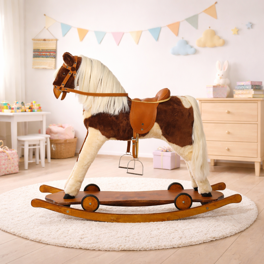 Unsere Schaukelpferde mit Rollen sind hochwertig verarbeitet, stabil konstruiert und in Sitzhöhen von ca. 60 bis 75 cm erhältlich. Je nach Modell kommen unterschiedliche Rollensysteme zum Einsatz – von klappbaren Rollen für flexible Nutzung bis hin zu klassischen Rollbrettern mit sicherem Stand. Die Konstruktion ist bewusst auf Stabilität und kontrollierte Bewegung ausgelegt, sodass ein sicheres Spielgefühl im Vordergrund steht.